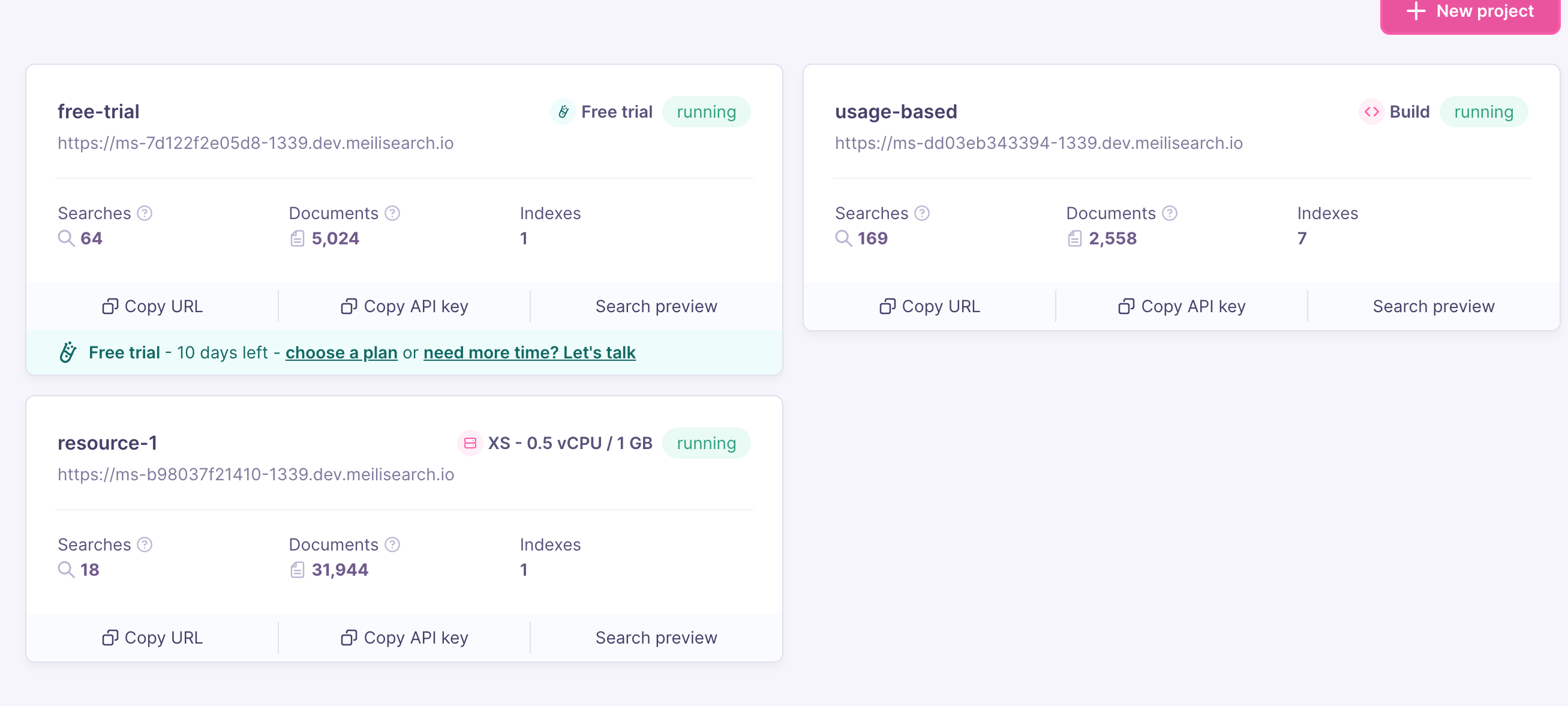 - More visibility: both resource-based and free-trial projects will now show current searches and documents metrics directly in the dashboard.