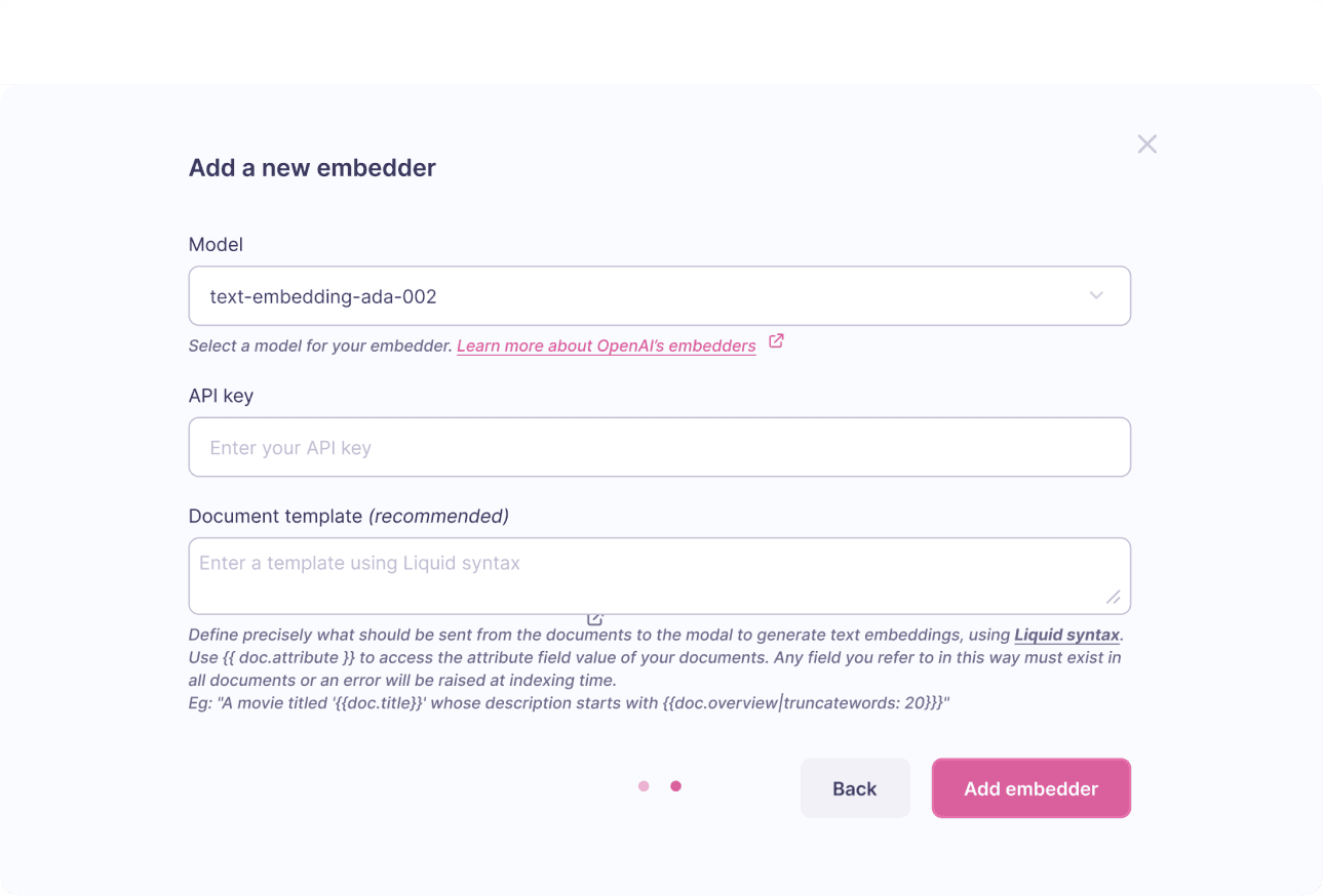 Add a new AI embedder in Meilisearch Cloud.